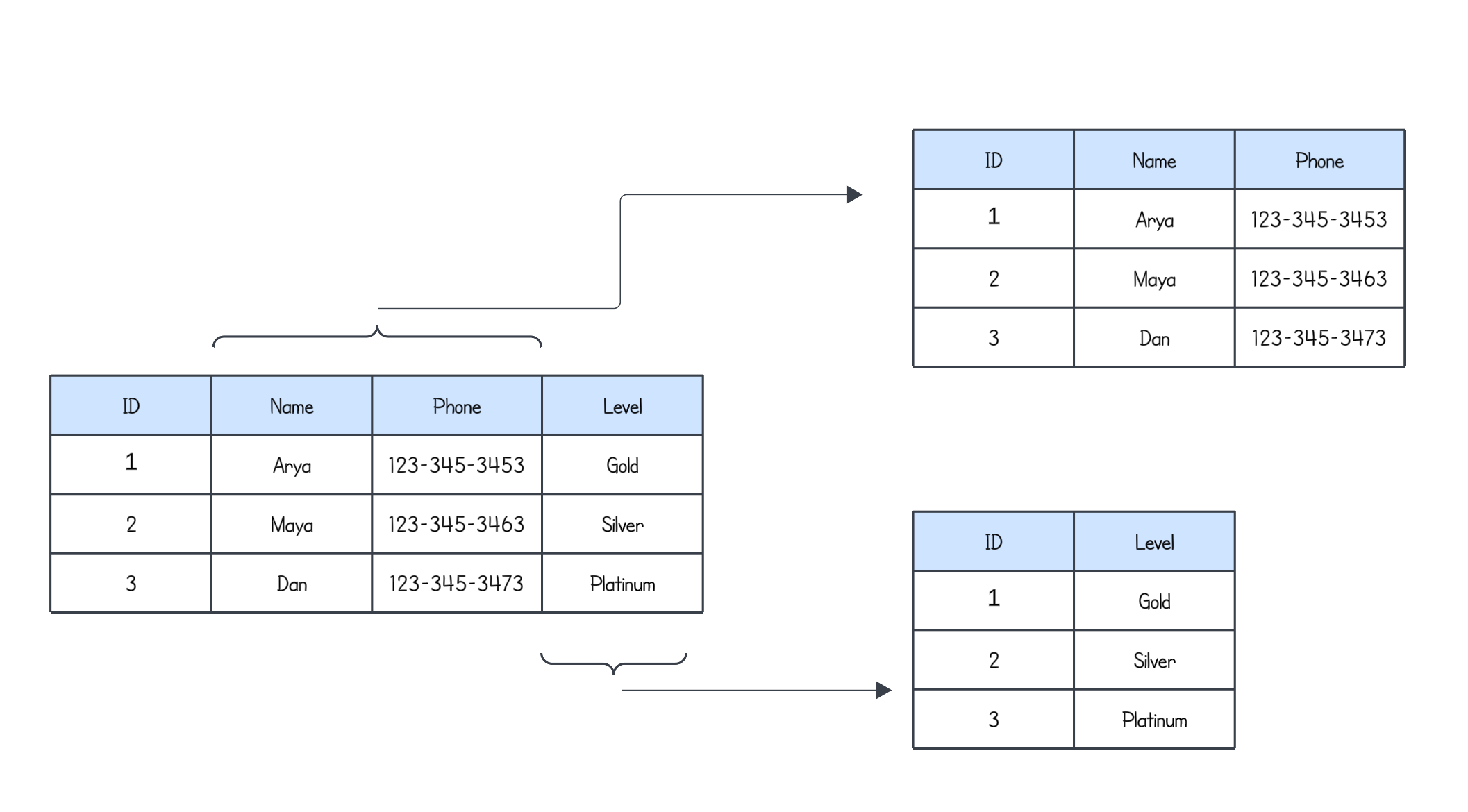 Vertical Partitioning: This involves dividing a table's columns into different partitions. For instance, one partition might store a subset of columns (like user personal details), and another partition stores other details (like preferences). This is less common than horizontal partitioning but can be useful for handling large tables with varying data access patterns.