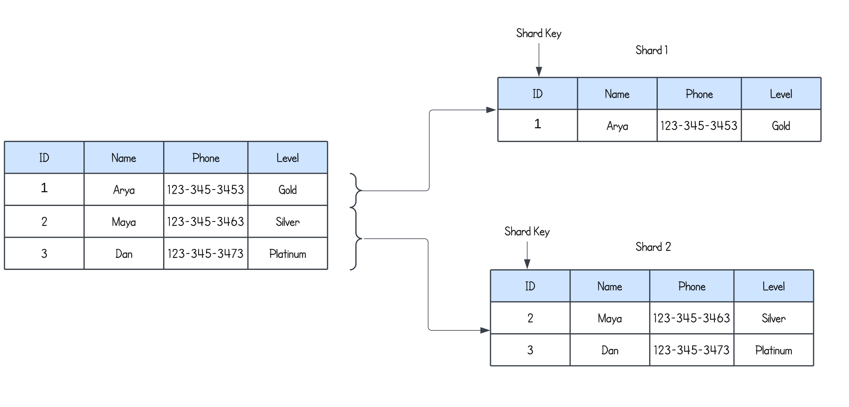 Horizontal Partitioning (Sharding): This involves splitting a table's rows into separate partitions. Each partition may be stored on a different database server or node, which helps distribute the load. For example, you might split a user table by the first letter of the user's last name or by a range of user IDs.